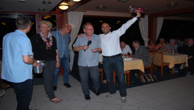 Mit zunehmender Dämmerung verlagerte sich das Geschehen immer mehr in das Innere des Schiffes, wo nun die beiden DJs das Kommando übernahmen und die Sportler sofort mit ihrer Musik auf die zentral gelegene Tanzfläche lockten. Nun waren die sportlichen Gäste ganz in ihrem Element, der Bewegung, die bei ausgelassener Stimmung so lange anhalten sollte, bis die Tombola einen weiteren Höhepunkt versprach. Hier galt es, neben vielen weiteren Preisen, vor allem eines der fünf begehrten “Pittermännchen“ zu gewinnen, was sich besonders die Mitglieder der Badmintonabteilung des SSV 04 wünschten. Trotz begeisternder La Ola-Wellen hatten sie bei der Glücksgöttin diesbezüglich kein Glück, konnten dann aber ausgerechnet mit der Ziehung des letzten Loses einen der anderen Hauptpreise gewinnen.