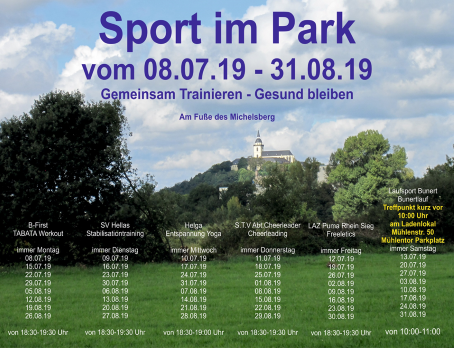 Sport im Park 2019 Das kostenlose Fitnessprogramm von der Barmer Ersatzkasse und dem Stadtsportverband Siegburg wird 2019 fortgesetzt. Detailierter Zeitplan zum Download: