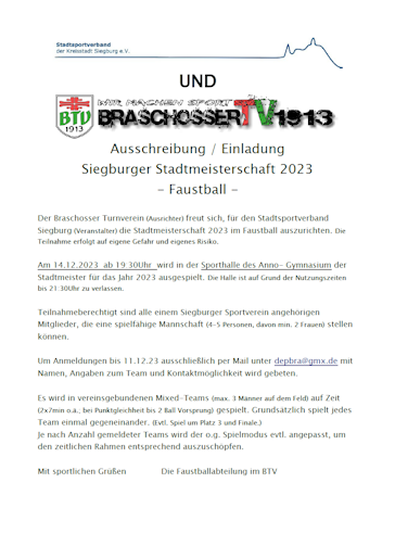 Stadtmeisterschaften Faustball Informationen zur Stadtmeisterschaft im Faustball des Braschosser Turnverein